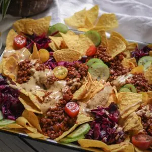 - Place the taco chips on a large plate or platter. Add marinated red cabbage. Spread lentil sauce over the nachos. Add cucumber slices and cocktail tomatoes to the chips and sprinkle the cashew sauce over the whole thing. Best enjoyed still warm.