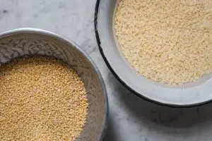 - 200 g geschälte Mungbohnen mehrfach spülen und waschen, bis das Wasser weitestgehend klar bleibt. Dann Mungbohnen 4-6 Stunden in Wasser einweichen. Sie quellen stark auf und verdoppeln sich in etwa im Volumen. Anschließend Einweichwasser abgießen und Mungbohnen nochmals spülen. Auf dem nachstehenden Foto siehst Du links getrocknete geschälte Mungbohnen und rechts, wie sie nach der Einweichzeit aussehen.