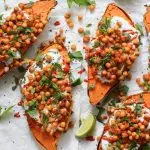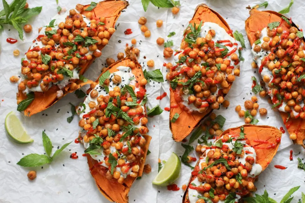 - Süßkartoffeln halbieren. Das Fruchtfleisch rautenförmig einschneiden und etwas auseinanderziehen, damit die Soße hineinsickern kann. Tomatensoße auf die Kartoffeln verteilen und die Joghurtsoße darüber geben. Geröstete Kichererbsen über die Süßkartoffel-Hälften verteilen und diese mit Minze bestreuen. Gericht mit schwarzen Sesamkörnern und Limetten garnieren.