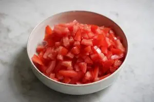 - In der Zwischenzeit 700-750 g Tomaten waschen, achteln, entkernen und würfeln.