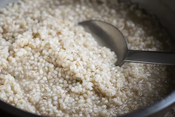 - Zwiebel(n) schälen, halbieren und in hauchdünne Streifen schneiden. Graupen abwiegen und in einem Sieb unter fließendem Wasser gut abspülen. 2 EL Öl in einem Topf erhitzen. Die Hälfte der Zwiebeln im heißen Fett glasig dünsten. die gewaschenen Graupen dazu geben und kurz anrösten. Das Ganze mit einem Schuss Weißwein ablöschen und mit ca. 300 ml Brühe aufgießen. Hitze reduzieren und die Graupen ca. 10 Minuten köcheln lassen. Ab und an ein wenig Brühe nachgießen und immer wieder umrühren.