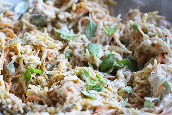 Tipp: Um Gemüse wie Zucchini, Karotten oder Rüben jeglicher Art in hauchdünne Streifen zu schneiden, benutze ich eine Julienne-Reibe bzw. einen Julienne-Hobel von Gefu*. Mit meinem CODE "LeaGreen15" erhältst du 15% Rabatt. Genial, oder?