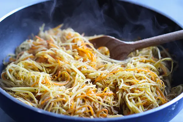 - Eine Schalotte oder kleine Zwiebel schälen und in feine Würfel schneiden. Die Pastinaken, Möhren und die Steckrübe gut waschen, die Ende abschneiden und die Rüben mit einer Julienne-Reibe bzw. einem Julienne-Hobel in feine Streifen rappen.