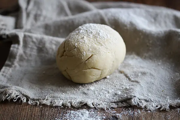 - Mehl, Hartweizengrieß, Sojajoghurt, Meersalz, Backpulver und Mandelmilch in eine Rührschüssel geben und mit den Händen zu einem Teig kneten. Sobald möglich, Teig aus der Schüssel auf eine bemehlte Arbeitsfläche geben und 3 Minuten zu einer geschmeidigen Teigkugel verkneten.