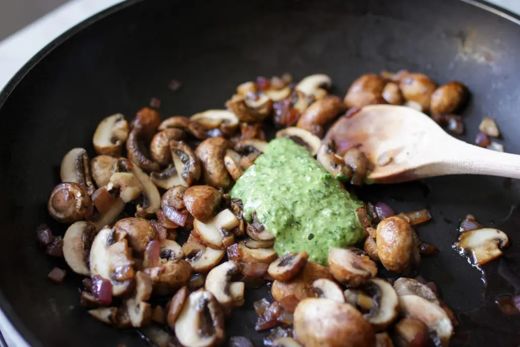 - Da das Bärlauchpesto schnell gemacht ist und die Kartoffeln bei mir dann meist immer noch kochen, bereite ich auch die Champignons schon vor. Dafür die Champignons putzen, die Stiele einkürzen und in Scheiben schneiden. Eine kleine Zwiebel schälen und fein aufschneiden. Öl in einer Pfanne erhitzen, die Zwiebelwürfel kurz andünsten, Champignonscheiben dazu geben und einige Minuten scharf anbraten. Dann die Zutaten mit 1-2 TL Sojasoße ablöschen, mit 1 TL Bärlauchpesto vermengen vom Herd nehmen.