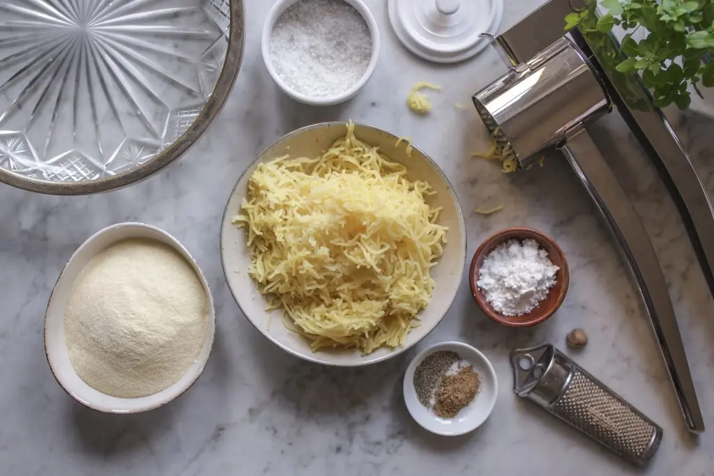 - 500 g Kartoffeln mit Schale in reichlich gesalzenem Wasser ca. 25-30 Minuten weich kochen, abkühlen lassen, pellen und durch eine Kartoffelpresse* drücken.