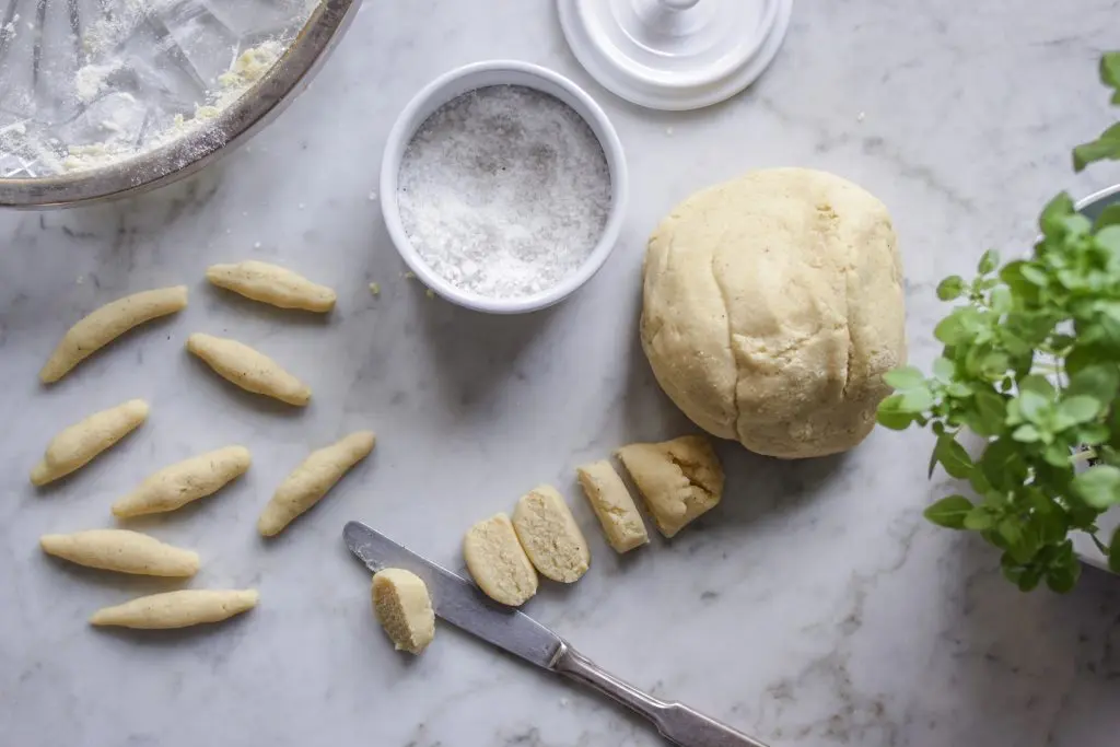 - Gepresste Kartoffeln mit 250 g Hartweizengrieß, einer Prise Salz, etwas Pfeffer, einer großen Prise frisch aufgeriebenen Muskatnuss, gemahlenem Kümmel und 1 EL Kartoffelmehl zu einem geschmeidigen Teig verkneten. Teig in 6-8 Stücke teilen, diese länglich rollen, kleine Portionen abstechen und zwischen den Händen zu Schupfnudeln formen.