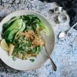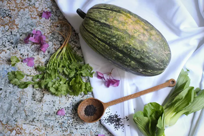 - Kürbis-Spaghetti auf zwei Teller aufteilen. Angebratenen Pak Choi-Hälften dazu geben und das Gericht mit schwarzen Sesamkörnern bestreut und Koriander garniert servieren. Wer mag, gibt zusätzlich noch einen Klacks Erdnuss-Soße auf das Gericht.