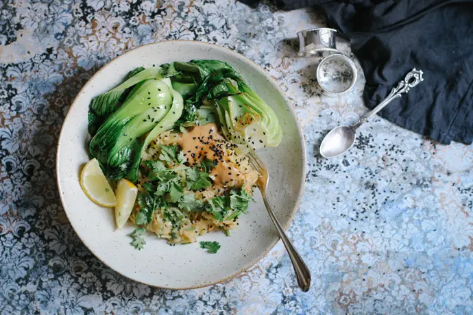 - 1 EL Kokosöl in einer Pfanne erhitzen 6 Pak Choi Köpfchen halbieren und beidseitig im heißen Fett anbraten, etwas salzen und mit Zitronensaft beträufeln.