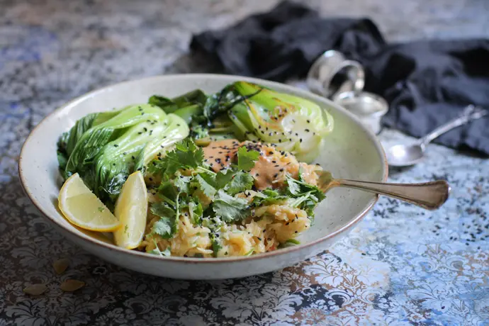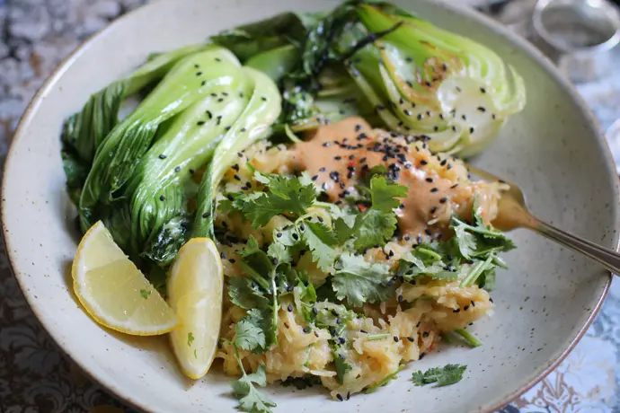 - 1 EL Kokosöl in einer Pfanne erhitzen 6 Pak Choi Köpfchen halbieren und beidseitig im heißen Fett anbraten, etwas salzen und mit Zitronensaft beträufeln.