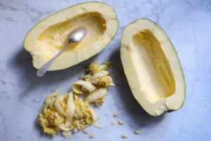 - Die Kerne der Kürbishälften mit einem Löffel entfernen.