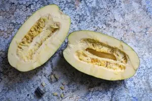 - Den Spaghetti-Kürbis mit einem Messer vorsichtig halbieren. Hier braucht Ihr etwas Geduld und Muskelkraft, denn die Schale ist sehr hart. Benutzt daher ein wirklich stabiles, großes Messer und verletzt Euch bitte nicht.