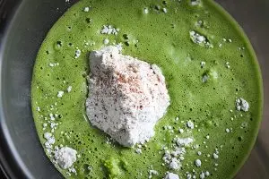 - Dinkelmehl und Backpulver in einer Rührschüssel vermischen. Hafermilch, Spinat und Sojasoße in einen Mixer geben und zu einer grünen, flüssigen Spinat-Milch mixen. Spinat-Milch mit dem Dinkelmehl und dem Backpulver vermischen.