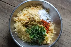 - Die Steckrüben- und Kartoffelraspeln in eine große Schüssel geben. Eine Zwiebel schälen und fein Würfeln. Ein halbes Bund Petersilie waschen, trocken schütteln und hacken. Zwiebelwürfel und gehackte Petersilie zusammen mit etwas Kichererbsenmehl und Kartoffelmehl mit den Raspeln gut vermengen. Die Rösti-Masse mit reichlich Salz, schwarzem Pfeffer, süßem Paprikapulver, etwas Kreuzkümmel und gemahlenem Kümmel würzen. Alles gut miteinander vermengen.
