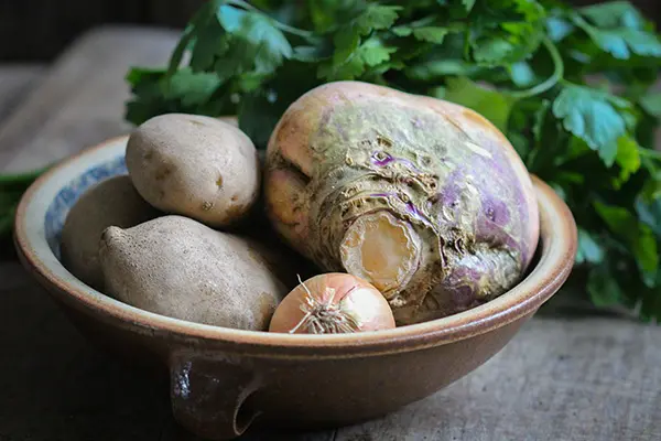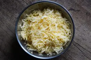- Nun zu den Steckrübenrösti. Für die Rösti werden Steckrübe und Kartoffeln geschält. Dann alle Knollen mit einer Küchenrappe in feine Raspeln reiben.