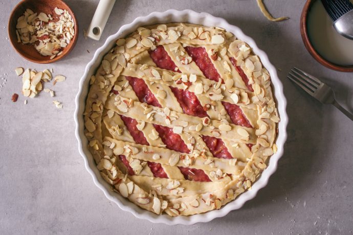 - Die Streifen über Kreuz auf die Füllung legen und leicht am Teigrand festdrücken. 1-2 längere Teigstreifen rund über den Teigrand legen. Die Teigstreifen sowie den Teigrand mit Sojadrink (oder einem anderen Pflanzendrink) bepinseln und mit Mandelblättchen bestreuen.
