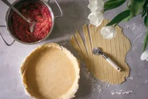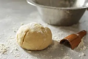 - 250 g Dinkelmehl in eine Schüssel sieben, 130 g Margarine in kleine Flöckchen geschnitten hinzu geben, eine Prise Salz und 4 EL kaltes Wasser zugeben und verkneten. Teig auf einer kräftig bemehlten Arbeitsfläche zügig zu einer geschmeidigen Kugel kneten. Teig bis zur Verwendung abgedeckt in den Kühlschrank stellen.