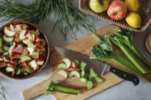 - Rhabarberstangen und einen Apfel waschen, Rhabarberblätter entfernen. 300-320 g Rhabarber in kleine Stücke schneiden. Apfel entkernen und würfeln.