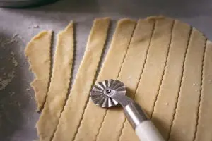 - Nun den restlichen Teig auf einer leicht bemehlten Arbeitsfläche ausrollen und in Streifen schneiden.