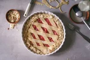 - Die Streifen über Kreuz auf die Füllung legen und leicht am Teigrand festdrücken. 1-2 längere Teigstreifen rund über den Teigrand legen. Die Teigstreifen sowie den Teigrand mit Sojadrink (oder einem anderen Pflanzendrink) bepinseln und mit Mandelblättchen bestreuen.