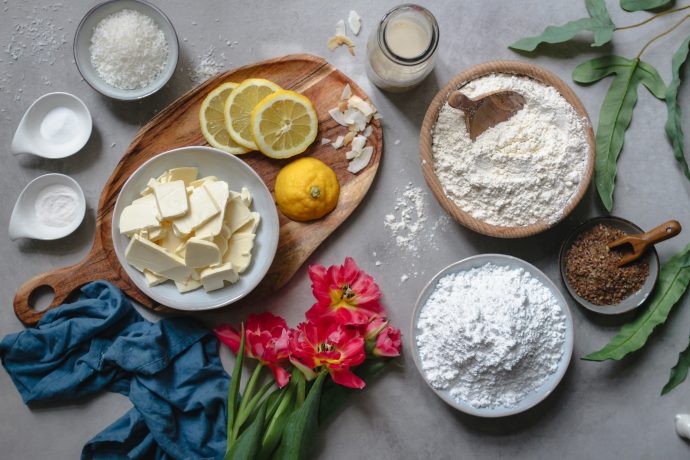 - Cremige Margarine in eine Schüssel geben und 280 g Dinkelmehl dazu sieben. 30 g Kokosraspel, 1 TL Backpulver und 1 TL Natron dazu geben und 1 EL Zitronensaft direkt auf das Natron träufeln, bis es schäumt. Gequollene Leinsamen und Pflanzendrink dazu geben. Mit dem Handrührgerät zügig den Teig geschmeidig rühren.