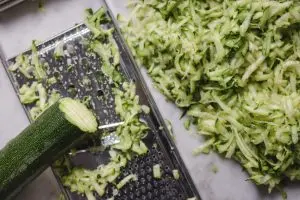 - 200 g Zucchini waschen, Enden entfernen und mit einer Hausghaltsreibe* aufraspeln. Zucchiniraspel in einem sauberen Handtuch einmal kräftig über der Spüle auswringen.