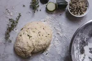- Nun die Schüssel mit dem mehl und dem mittig darin arbeitetren "Vorteig" nehmen, das restliche Mehl mit dem "Vorteig" leicht salzen, optional Chilipulver und Knoblauchgranulat dazu geben und alles miteinander verkneten. Die gebratenen Zwiebelstreifen, die geraspelte Zucchini sowie die Blättchen von 4-5 Thymianzweigen dazu geben und kräftig unterkneten. Teig anschließend auf einer bemehlten Arbeitsfläche 2-3 Minuten weiter kneten, bis er schön gleichmäßig ist und nicht mehr klebt. Je nachdem, wie feucht deine Zucchiniraspel noch waren, gebe noch ein klein wenig Mehl dazu.