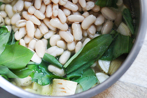 - Den Bärlauch hacken und mit den Cannellini-Bohnen zur köchelnden Suppe geben. Suppe umrühren und 12-15 Minuten köcheln lassen.